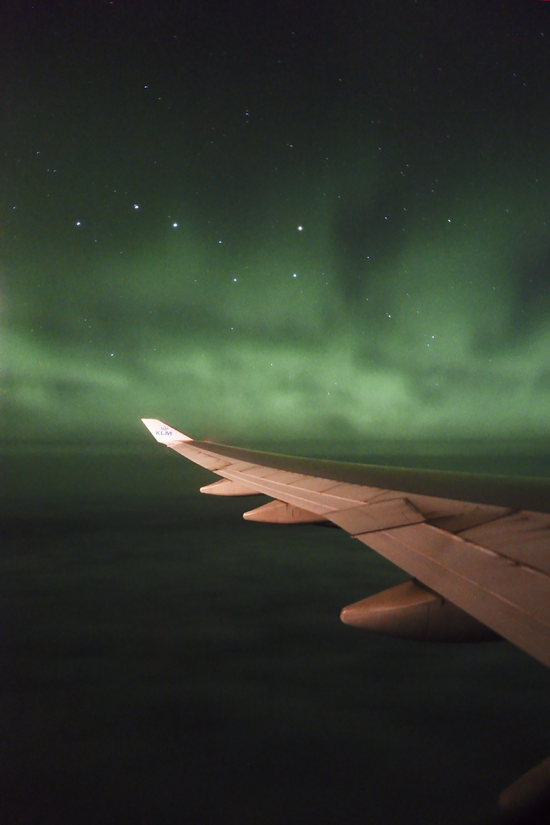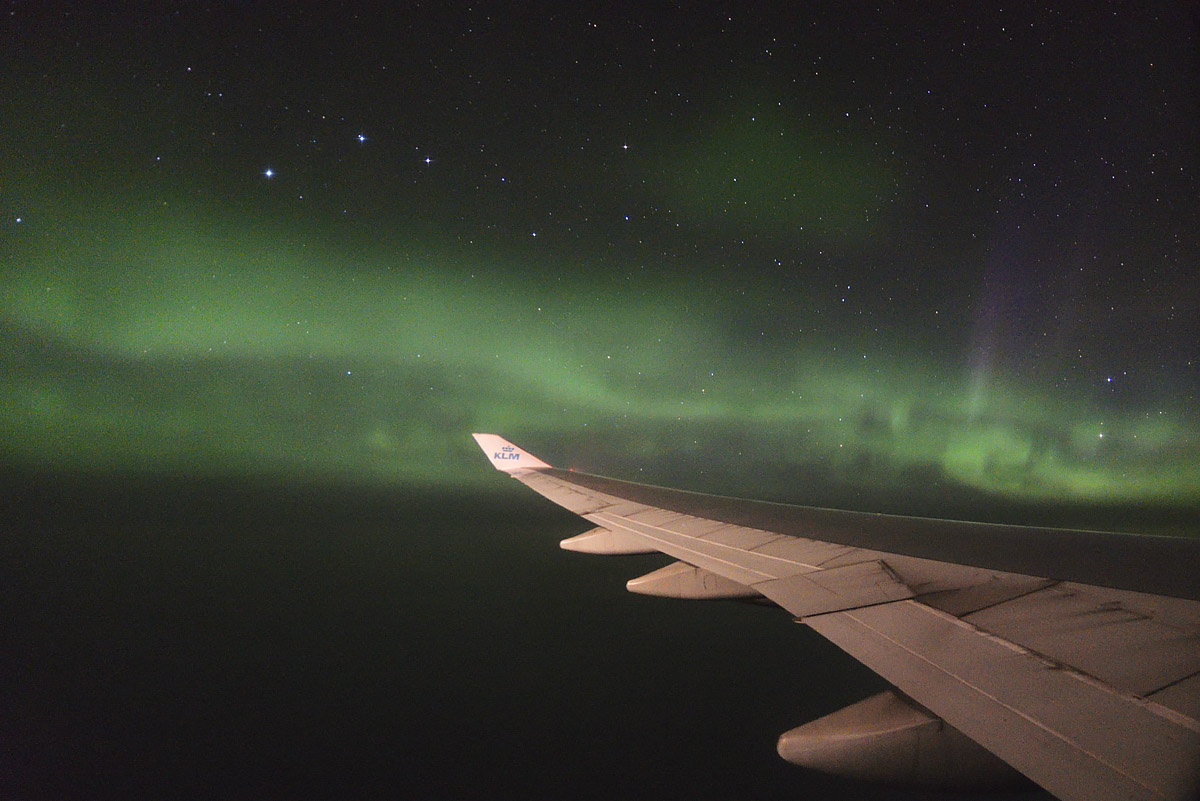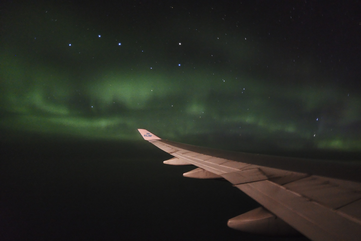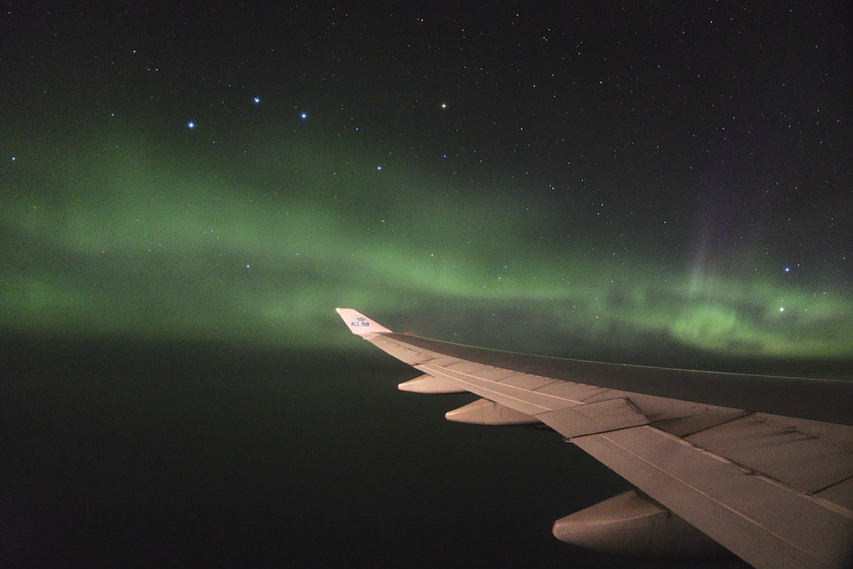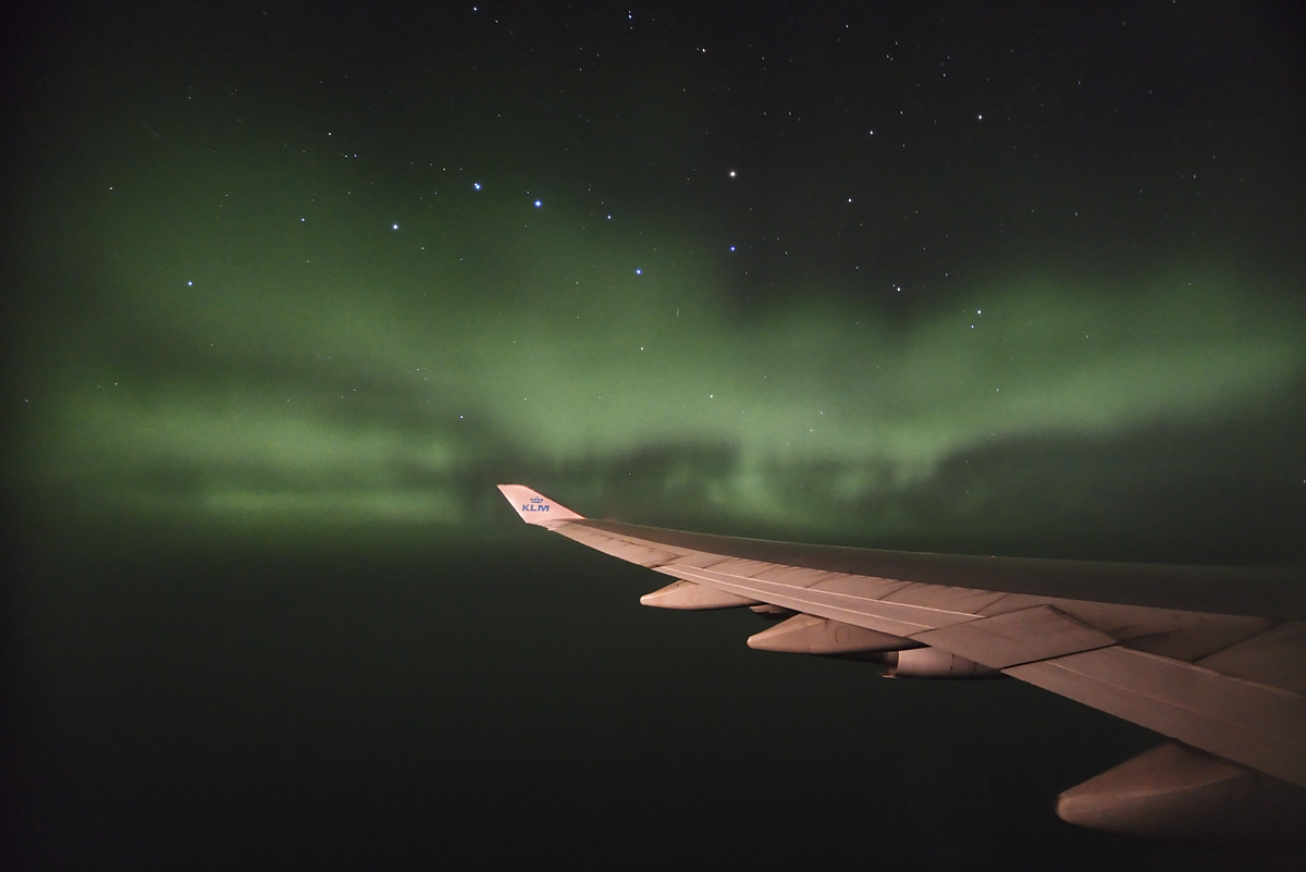 Na povratku iz USA i ekspedicije za gledanje potpune pomrčine Sunca, kao točku na i, doživjeli smo još jedan spektakl! Moja kćer Una je tijekom noćnog leta iz Chicaga do Amsterdama pogledala kroz prozor i primjetila neke čudne oblake… Ubrzo mi je sinulo da bi to mogla biti polarna svjetlost. Prijatelj Vid i ja smo brzo izvadili fotoaparate – i zaista, cijelo nebo bilo je prepuno polarne svjetlosti! Spektakl je bio fantastičan! Polarnu svjetlost gledali smo i fotografirali više od sat vremena. Bio je veliki problem držati aparat mirno na prozoru aviona. Una mi je pomagala tako da je držala dekicu preko aparata i prozora kako se ne bi vidjele refleksije unutrašnjosti o staklo. Da nema moje glavne asistentice, ne bi bilo ni ovako dobrih fotografija!
